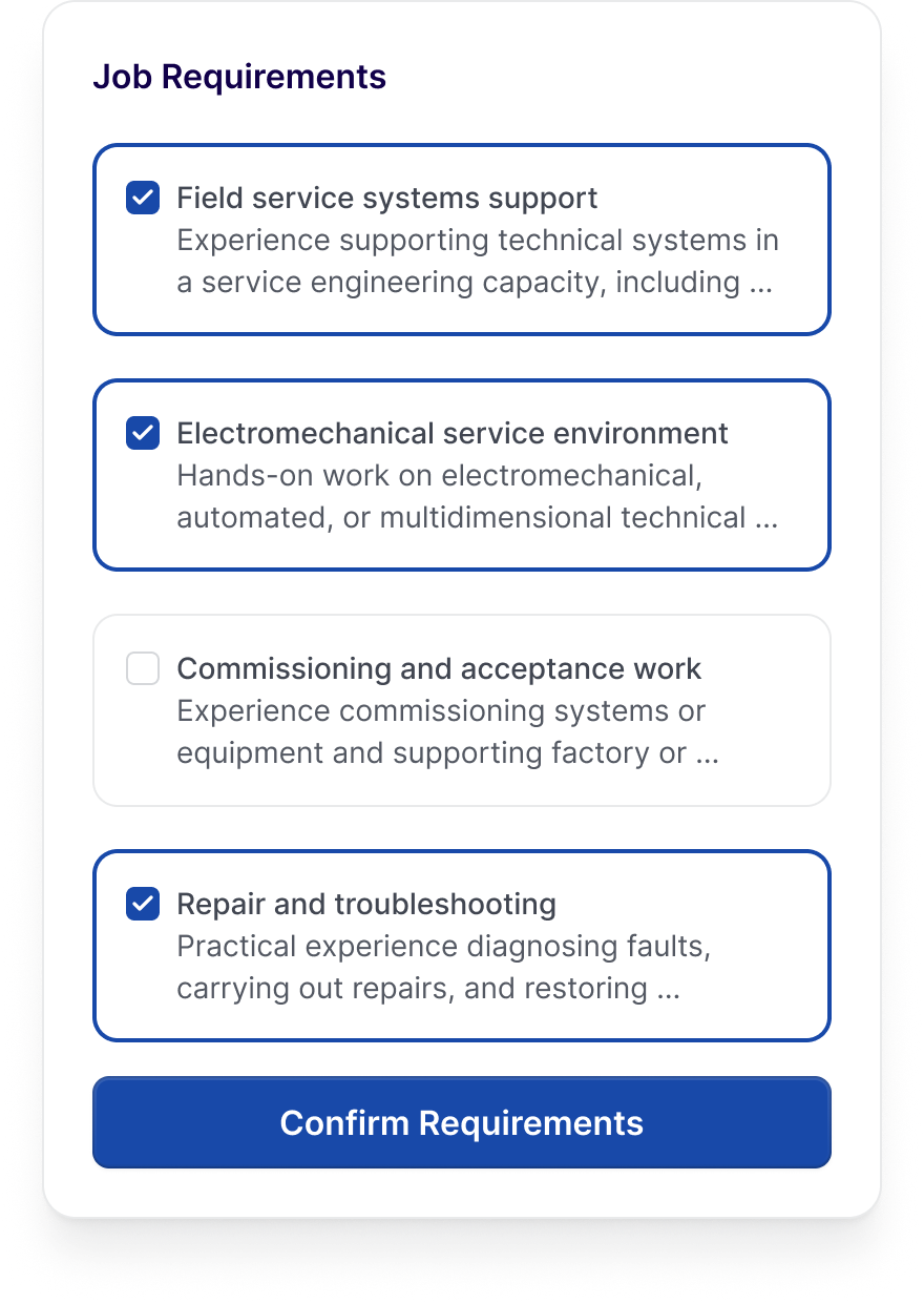 Browse, filter an see who matches, why they match, and where the gaps are.